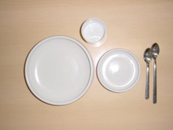 食器はスプーンの背に合ってすくいやすい形状で、ふちが90度の角度のもの、重さがあり、安定した陶器のものを使っています。